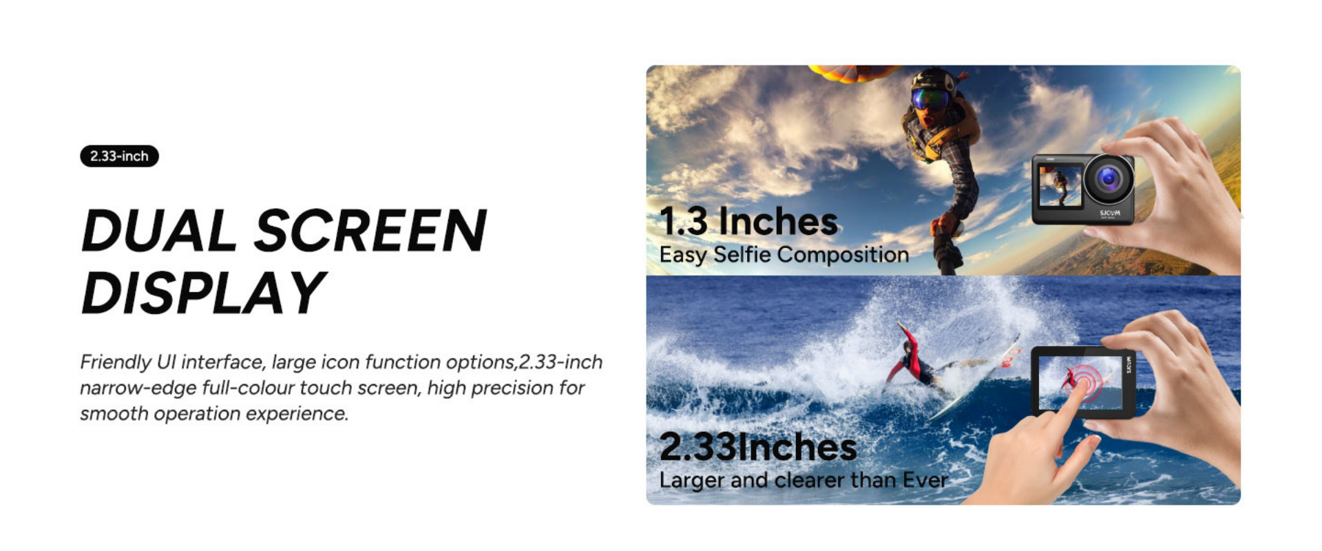 ✅ Características Destacadas: Doble pantalla 2.33"+1.3" • 4K 30FPS Sony • Estabilización 6 ejes • IP68 5m/30m • WiFi dual banda • 10+ modos grabación • 1300mAh batería • 108g peso • Streaming en vivo • Cámara web